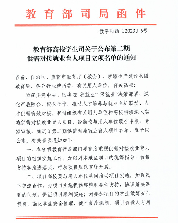 本网讯(通讯员 李娟)日前,教育部高校学生司发布了《教育部高校学生司关于公布第二期供需对接就业育人项目立项名单的通知》(教学司函〔2023〕6号),ky官网(中国)有7项供需对接就业育人项目被批准立项,其中定向人才培养培训项目2项、就业实习基地项目3项、人力资源提升项目2项。