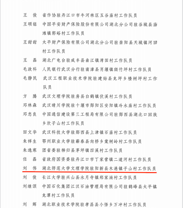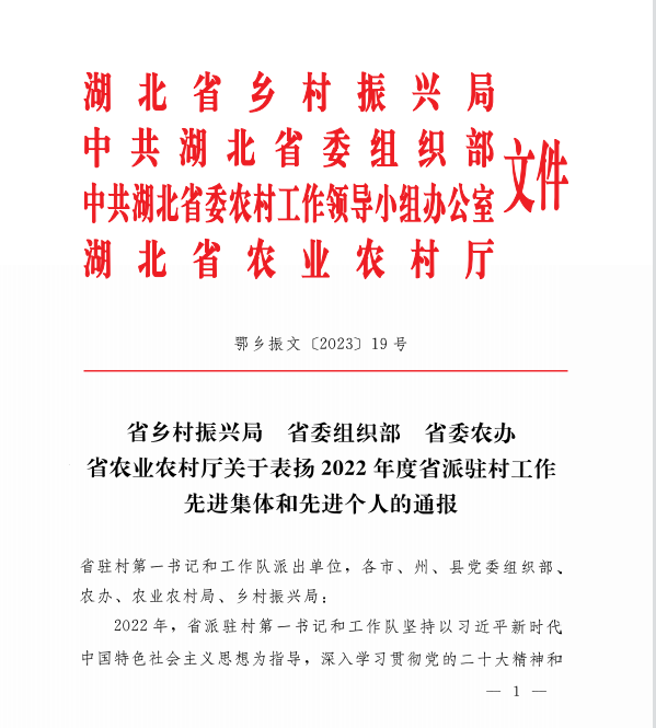 本网讯(通讯员 赵卫军)近日,湖北省乡村振兴局、省委组织部、省委农办、省农业农村厅联合下发《关于表扬2022年度省派驻村工作先进集体和先进个人的通报》,ky官网(中国)刘伟同志被评为2022年度工作突出驻村工作队员,系阳新县9支省派驻村工作队受表彰的2名队员之一。