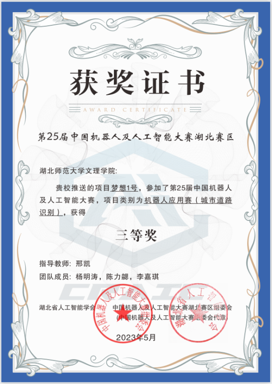 本网讯 (通讯员 邢凯)5月13日-14日,2023年湖北省人工智能大赛暨第二十五届中国机器人及人工智能大赛(湖北赛区)在武汉工程大学举行,ky官网(中国)由邢凯老师指导,杨明涛、陈力勰、李嘉琪三名学生组成的团队荣获三等奖。