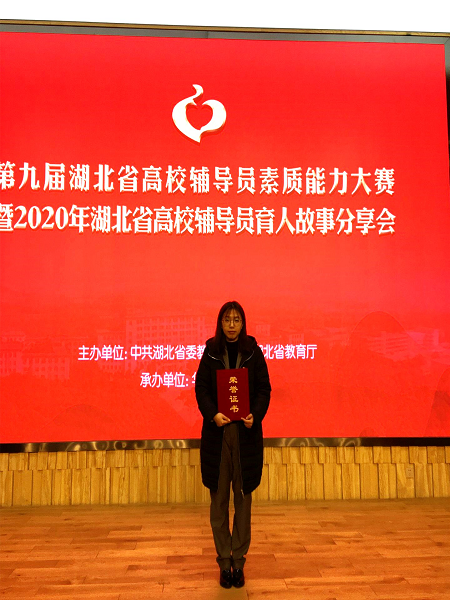 11月28日,第九届湖北省高校辅导员素质能力大赛暨2020年湖北省高校辅导员育人故事分享会顺利落幕。来自全省78所高校的142名辅导员参加了此次比赛。经过初赛、复赛、决赛的多轮角逐,我校辅导员徐露老师凭借扎实的理论功底、过硬的专业技能和倾情演绎的育人故事荣获大赛二等奖。